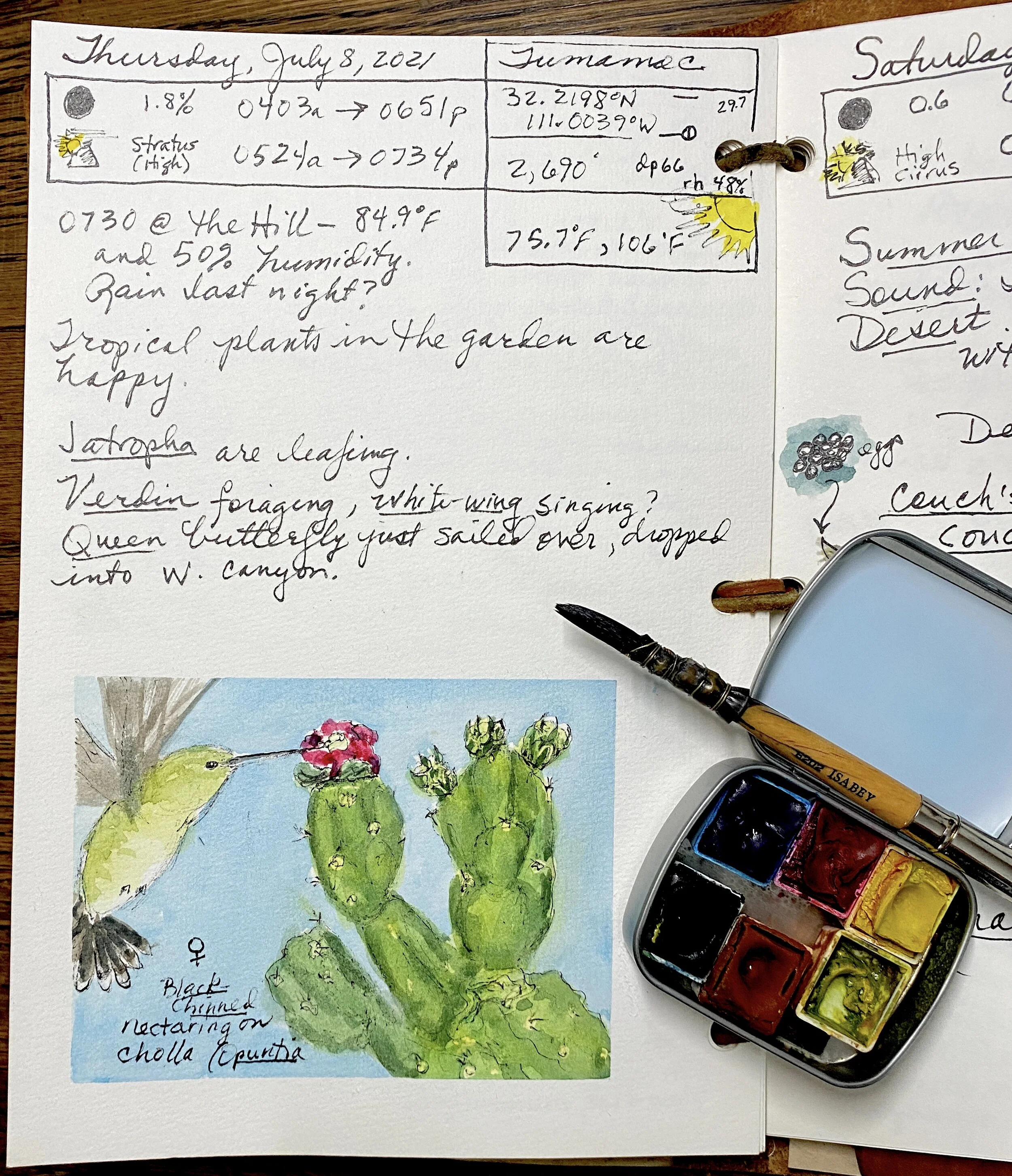 After my Weather 101 workshop in June, and then enjoying Bethan Burton’s “Skyscapitos” class at the Wild Wonder Nature Journaling Conference, I’ve been tackling lots of little sky- and cloud-scapes in my journal. In fact we’ve started a semi-regular “Skyscapito Appreciation Society” for sharing our work and enlisting help with challenging skies (first meeting on Zoom July 16 at 4 pm Pacific / Arizona time).
