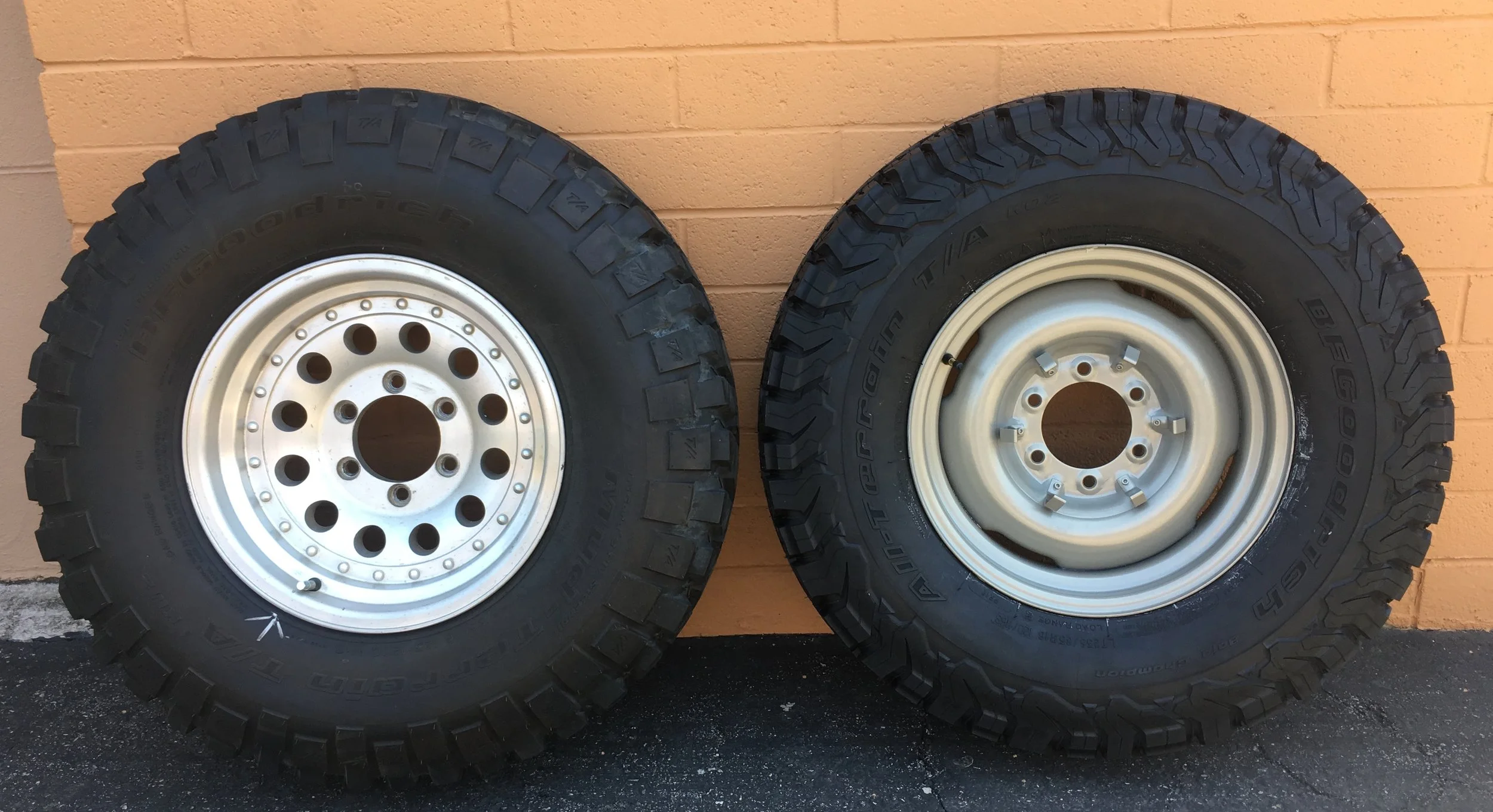 Left: 16 x 7 Alloy and 255/85 16 MT. Right: 16 x 5.5 steel and 235/85 16 AT. Same weight.