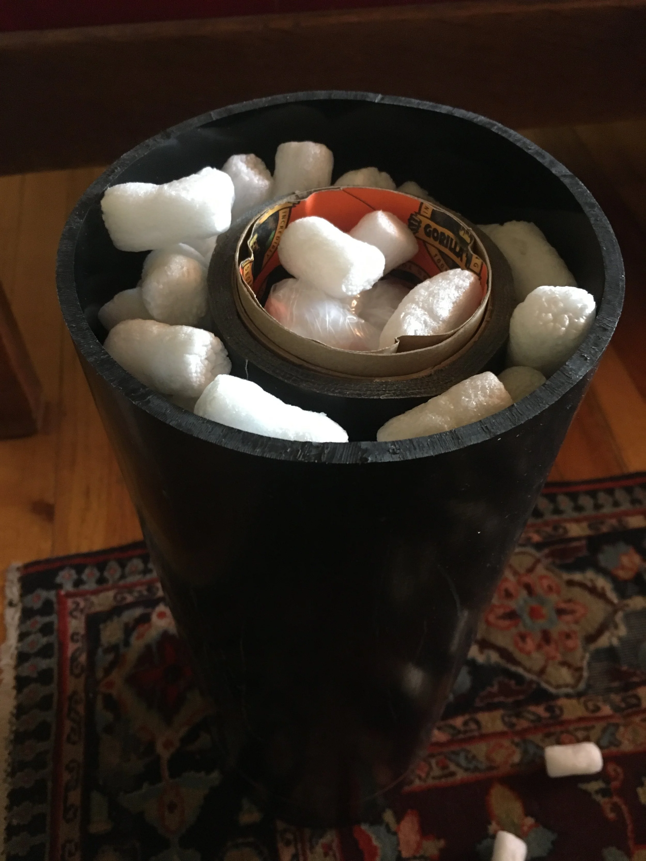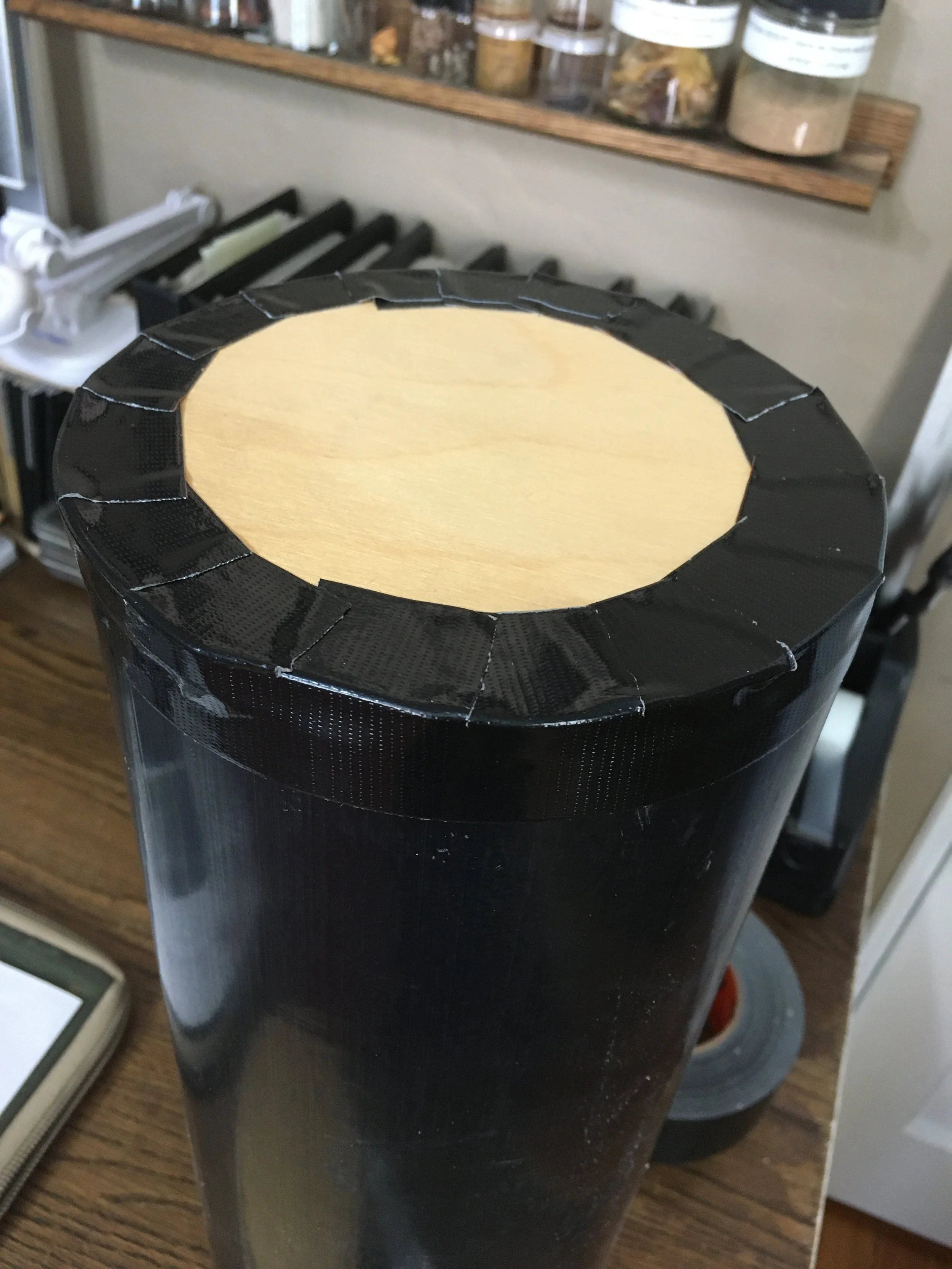 Nearly finished. I made sure the length was good, then used Gorilla tape to secure the “bottom” cap to the pipe, first with a piece around the edge, cut and overlapped thus: