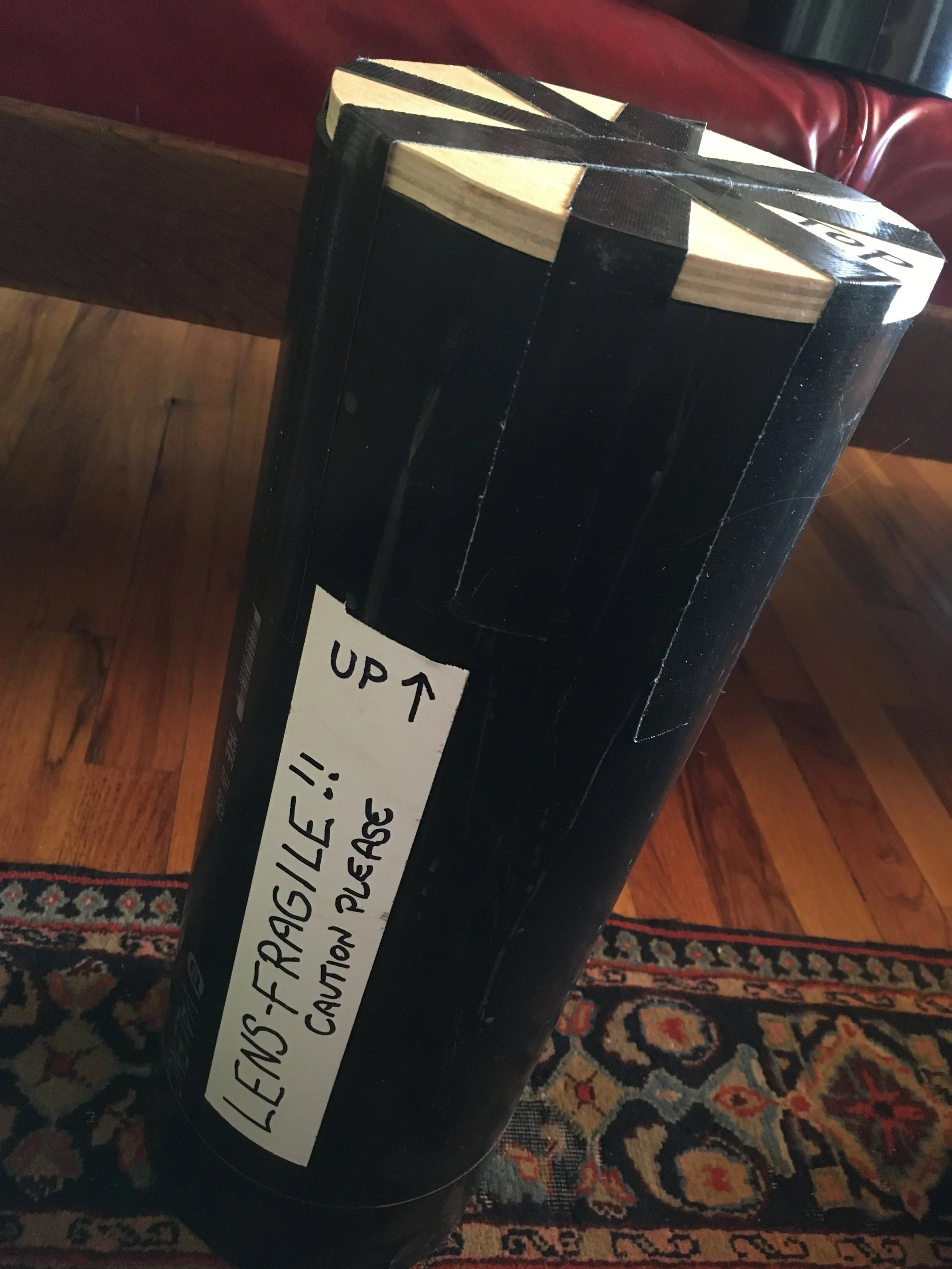All that remained was to load the lens—wrapped in a plastic bag to keep it dust-free—well-surrounded by packing peanuts. On top I inserted the remainder of the roll of tape to re-secure it on the way home—and also, I hoped, to allow anyone who might open it for inspection to re-secure it.