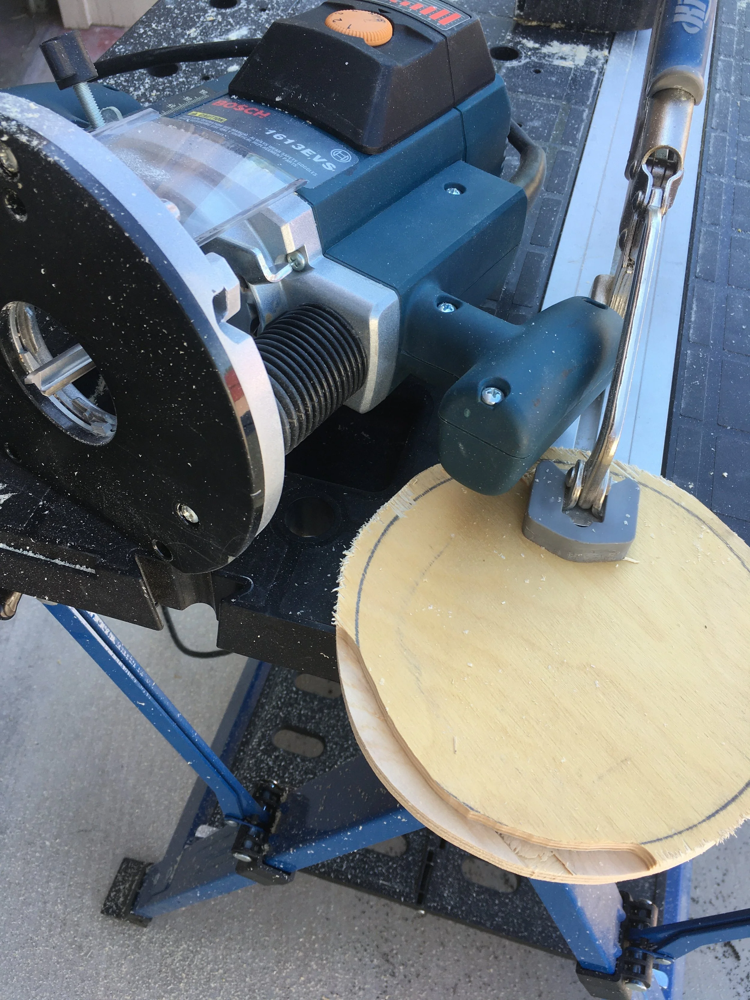 At Lowe’s Home Improvement I picked up an ABS stand pipe, six inches in diameter and 24 inches long, for the princely sum of $8.95 plus tax. Back home I picked out a scrap piece of 3/4-inch plywood (it happened to be Baltic birch but ordinary plywood would suffice). I traced the outer circumference of the pipe twice, then traced another circle inside each, a bit more than the thickness of the pipe wall. With a jigsaw I cut out each circle, then used a router to relieve the outer edge so each cap would fit securely into each end of the pipe.